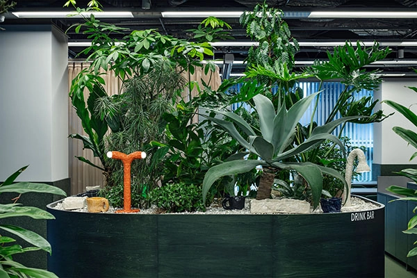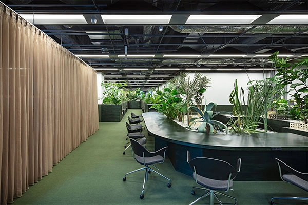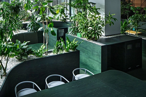 個人やチームの専有空間(=DISCOVER)と大きなワンルーム(=SHARE)となる空間的特徴がファミリーレストランのポテンシャルと解釈し空間を構築。活動に没入できるボックス席をメインに、ドリンクバーなどの目的地を点在させ、施設内を歩きまわることで、社員が周囲の活動から様々な刺激を受ける計画となっている。植栽やサイン計画では探究活動によって自らの考えが輪郭を帯びていく変遷を表現。社員へ向けてのメッセージを散りばめた空間とした。