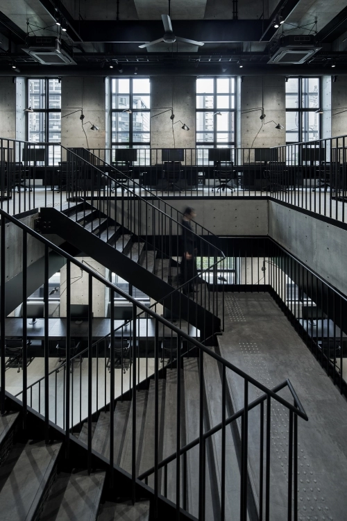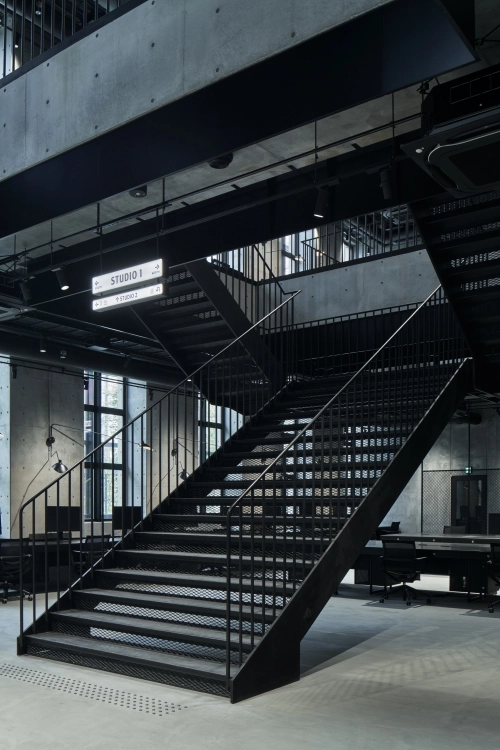 各フロアは「没頭」「解放」「高揚」をテーマに構成。多様な分野のデザイナーやITエンジニアが互いに熱量を高めてシナジーを促す。地上階には窓に面したロングデスクを設け、デザインに「没頭」できる場を設けた。一方で「解放」を象徴する仕掛けとして1階から2階につながる10mの吹抜けと大階段がある。人の気配が自然に感じられるこの空間では、日々、多様な交流が生まれるだろう。地下は「高揚」をテーマに天高8mのホールを設け、ワークショップや異業種間連携・産学連携など外部デザイン機関との共創を加速させる。3Dプリンターや塗装ブースを備えたプロトタイプ制作室や撮影スタジオ等、デザイナーの創造性を刺激しパフォーマンスを最大化させるための設備も備えている。