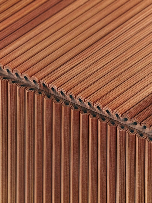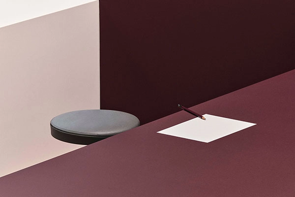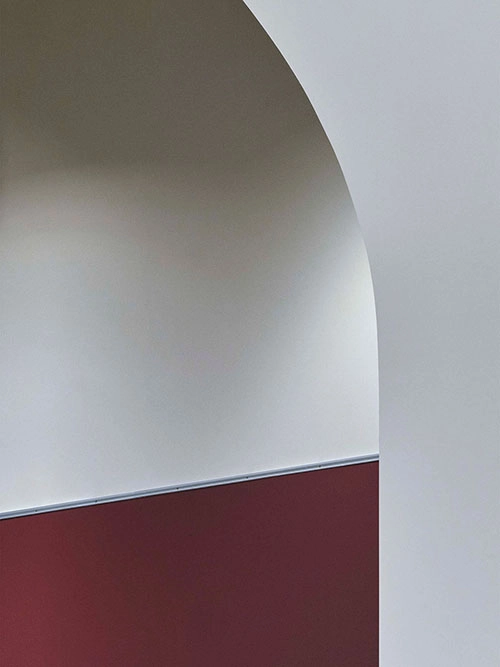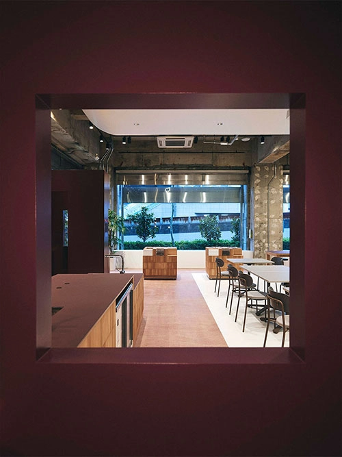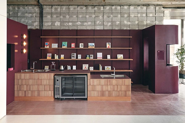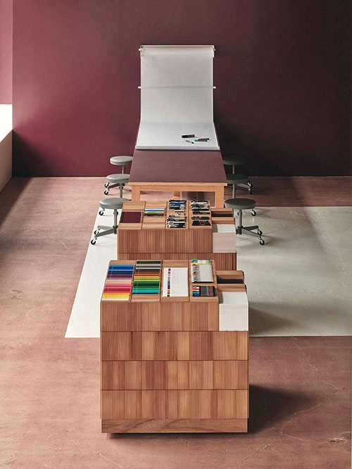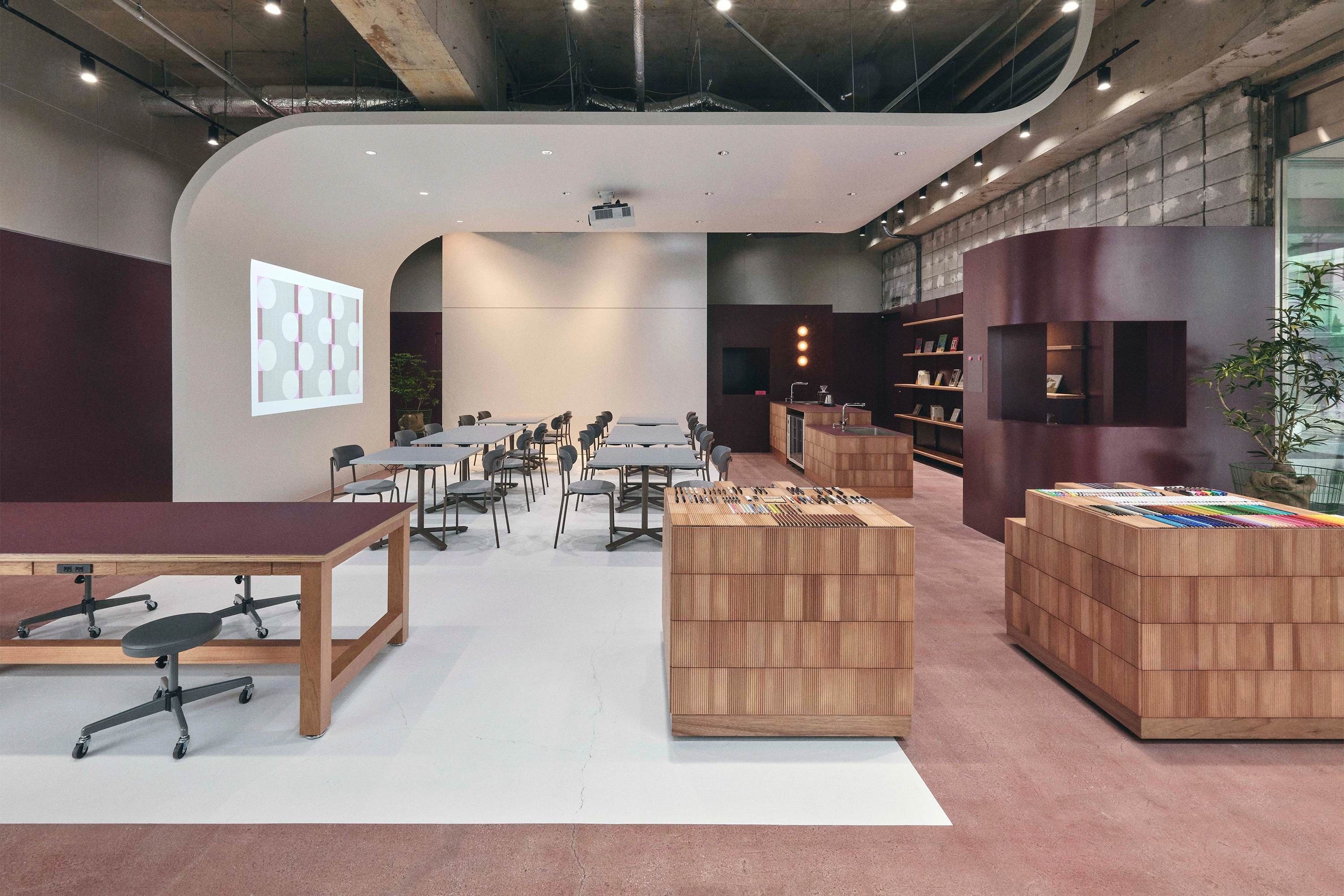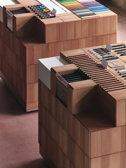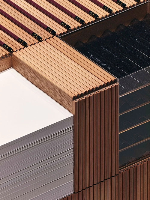 展示台や本棚には実際の鉛筆を使用している。約9300本の鉛筆、大きな紙のような弧を描く天井、三菱鉛筆を象徴する光沢のある えび茶色 が空間のキーエレメントである。スタジオ内には柔らかな木の香りが漂い、懐かしい創作の原体験を想起させる。
