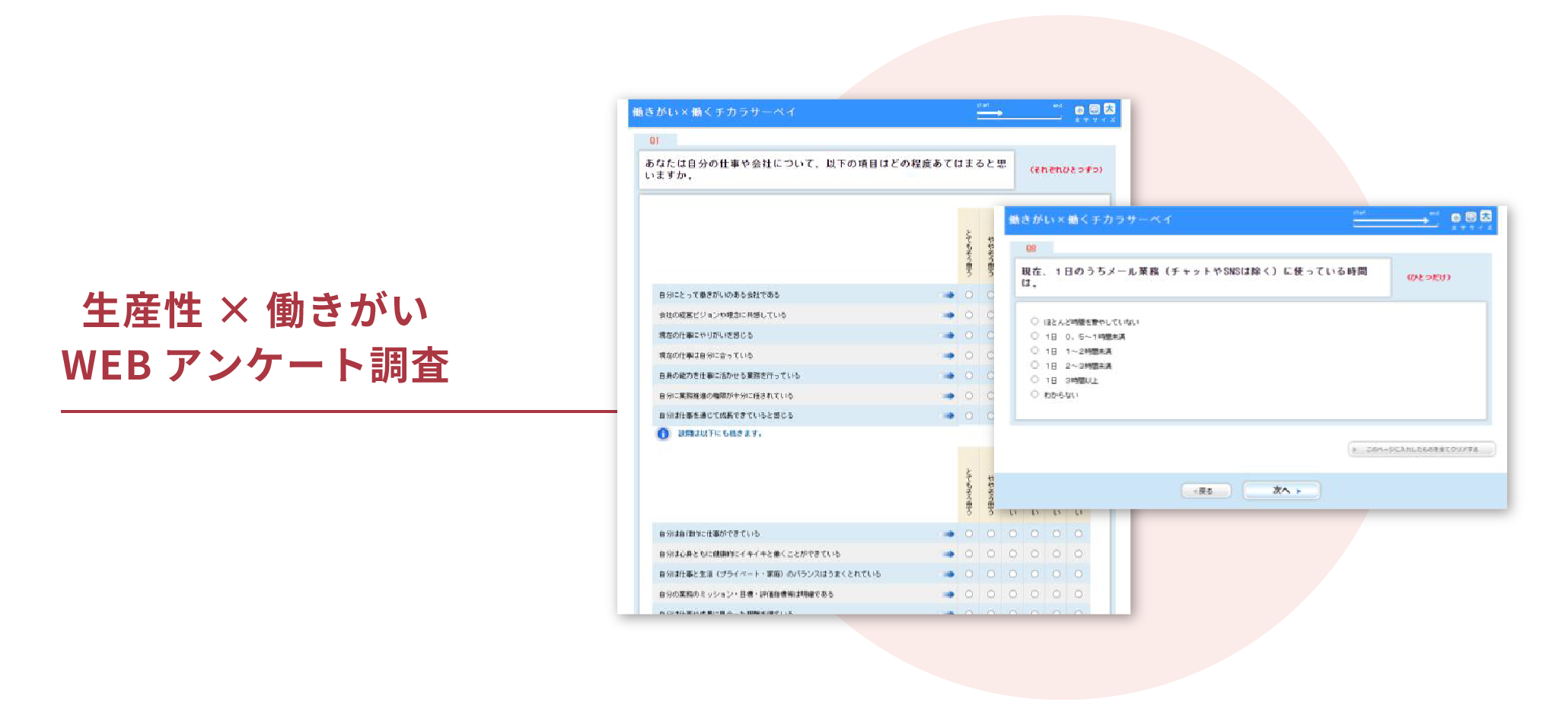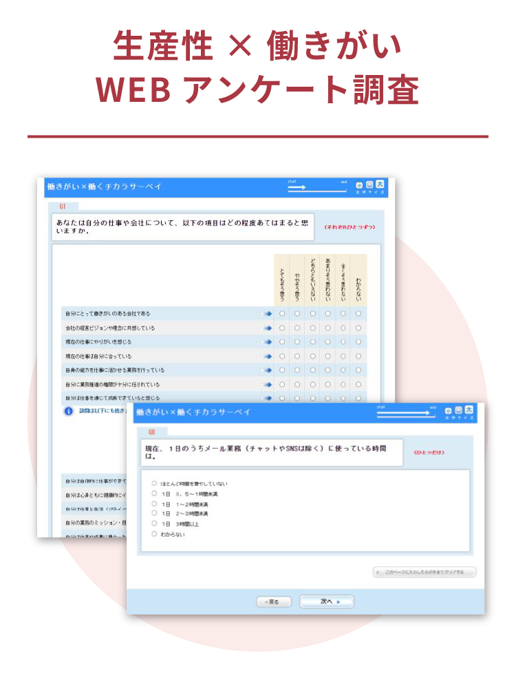 当サービスでは「生産性向上」と「エンゲージメント」の状況を確認する調査から