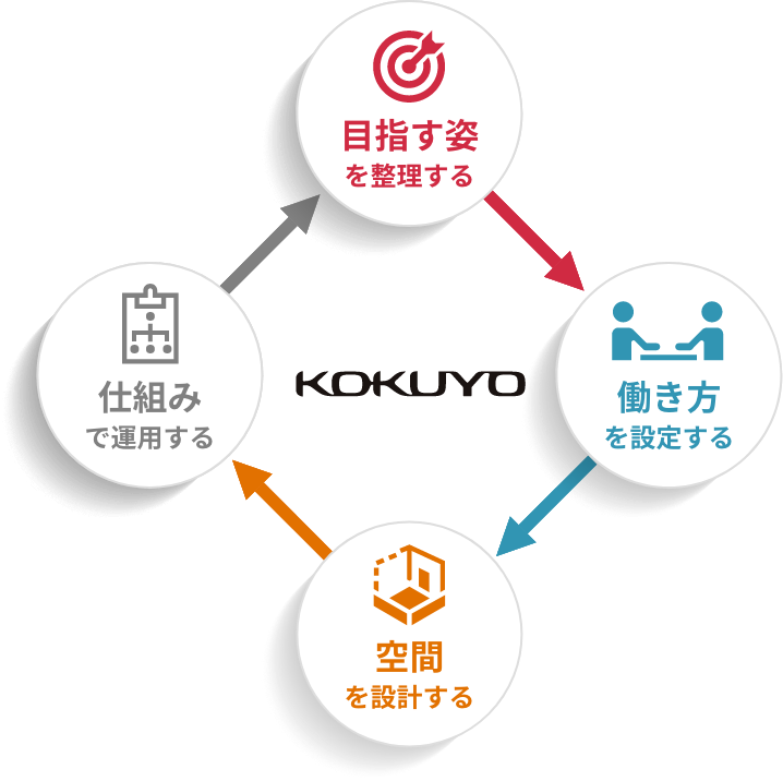 「目指す姿」(「ビジョン」)から「働き方」へ。「働き方」から「働く空間」へ。そして、それらの「目指す姿」が継続的に保てるように。