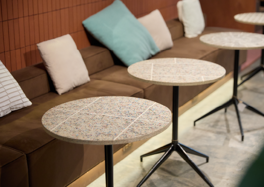 古紙を再利用したテーブル。周辺地域の駅や建築物のタイルをイメージした柄になっており、模様が一つひとつ異なる。