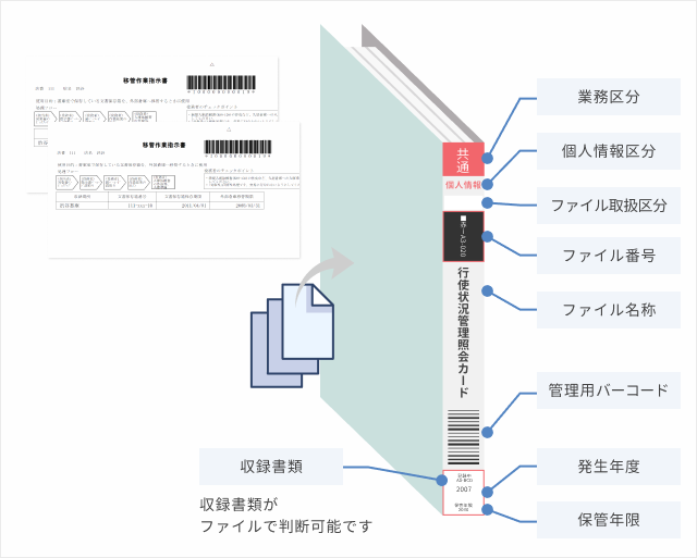 - 文書の所管部・保存期間・業務分類・帳票番号などを文書の管理基準で保有