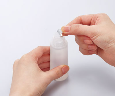 当社製品はお客様が使うときに開封していただくようになっており、キャップを上向きにし、時計回りに白いキャップ全体を最後まで締めこむと、内部のアルミチューブに穴が空きます。それから白いキャップフタを反時計回りに開ければ、液が出てくる状態になり使用できます。グレーまたはパープルのボタンを指で押すと、中身の液が出てきます。