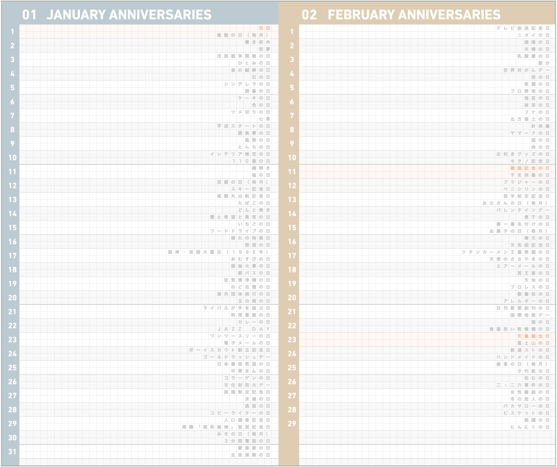 The more anniversaries you have, the richer your life will be. This section is also handy for noting down warranty expiration dates for household appliances. We’ve also listed some quirky anniversaries that make fun conversation-starters.