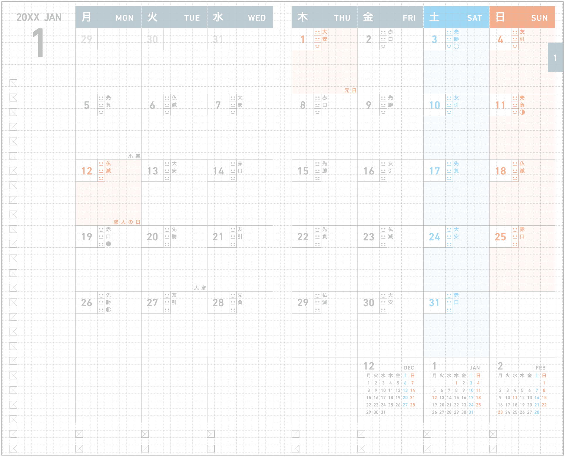The calendar block lets you see the whole month at a glance. For months that start in the middle of the week, the end of the previous month is also shown, making it easier to read. The calendar can be used until March of the following year.