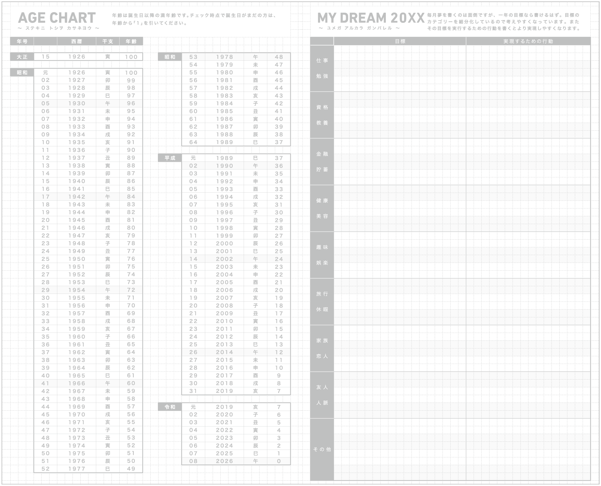 It makes more sense to note down your goals for the year instead of month-by-month. The goals section is also subdivided, making it easier to think things through. (On the left hand side is an age chart for finding out someone’s age quickly from their birth year.)