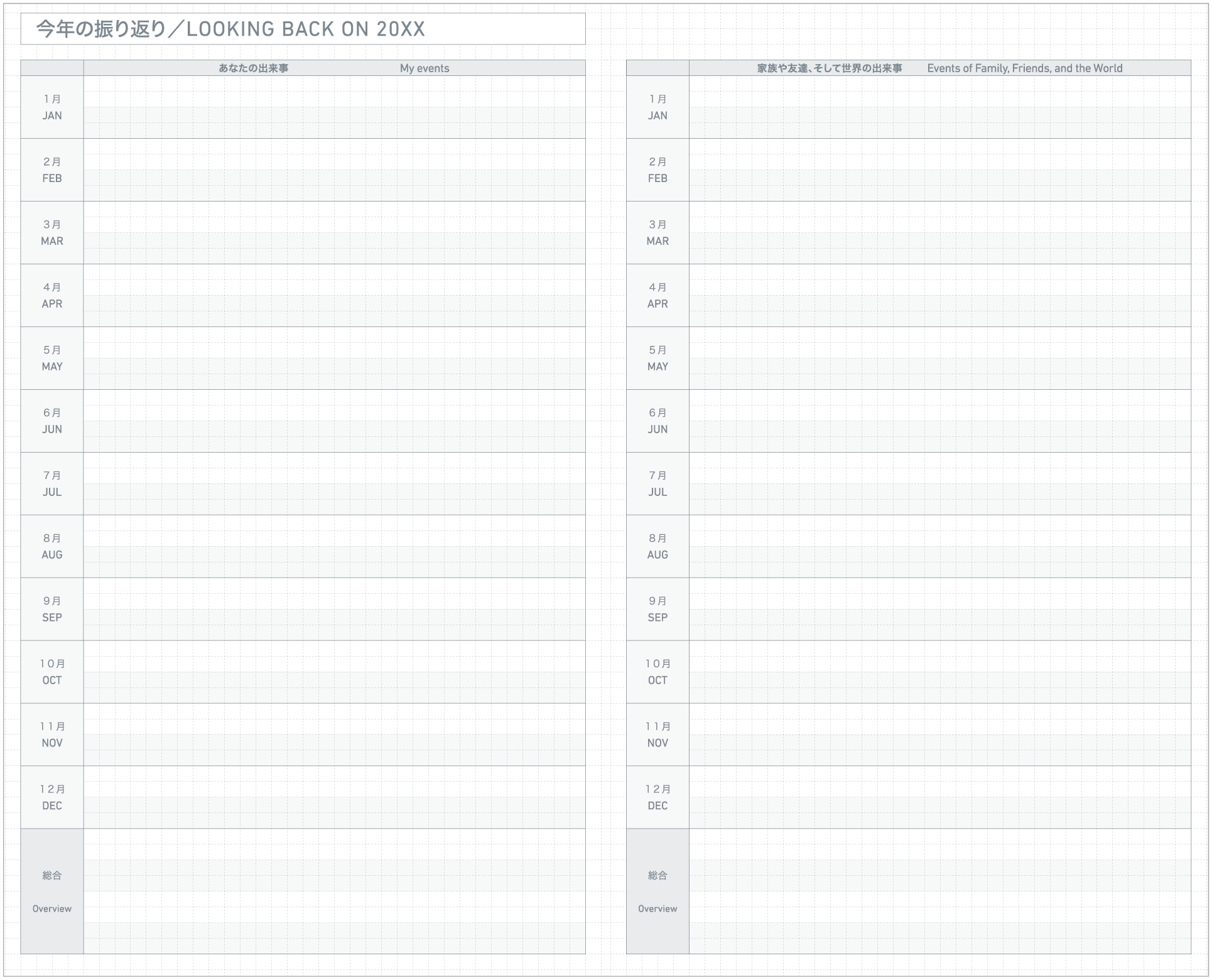 Use this spread to look back at your JIBUN_TECHO entries for the year and write in monthly summaries. This will give you an overview of what happened in 2024.