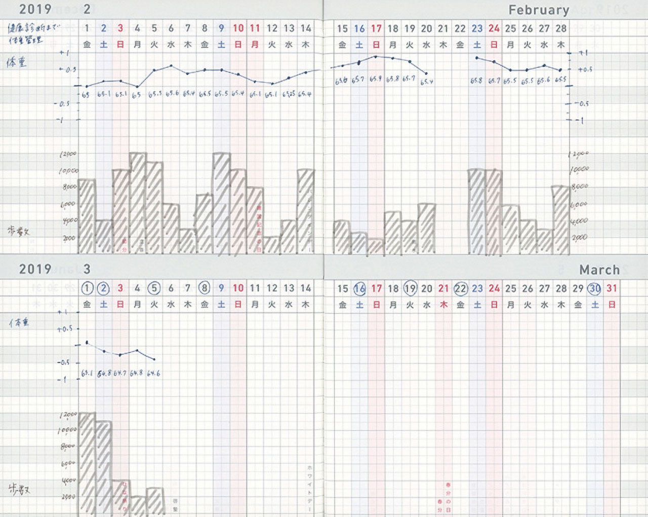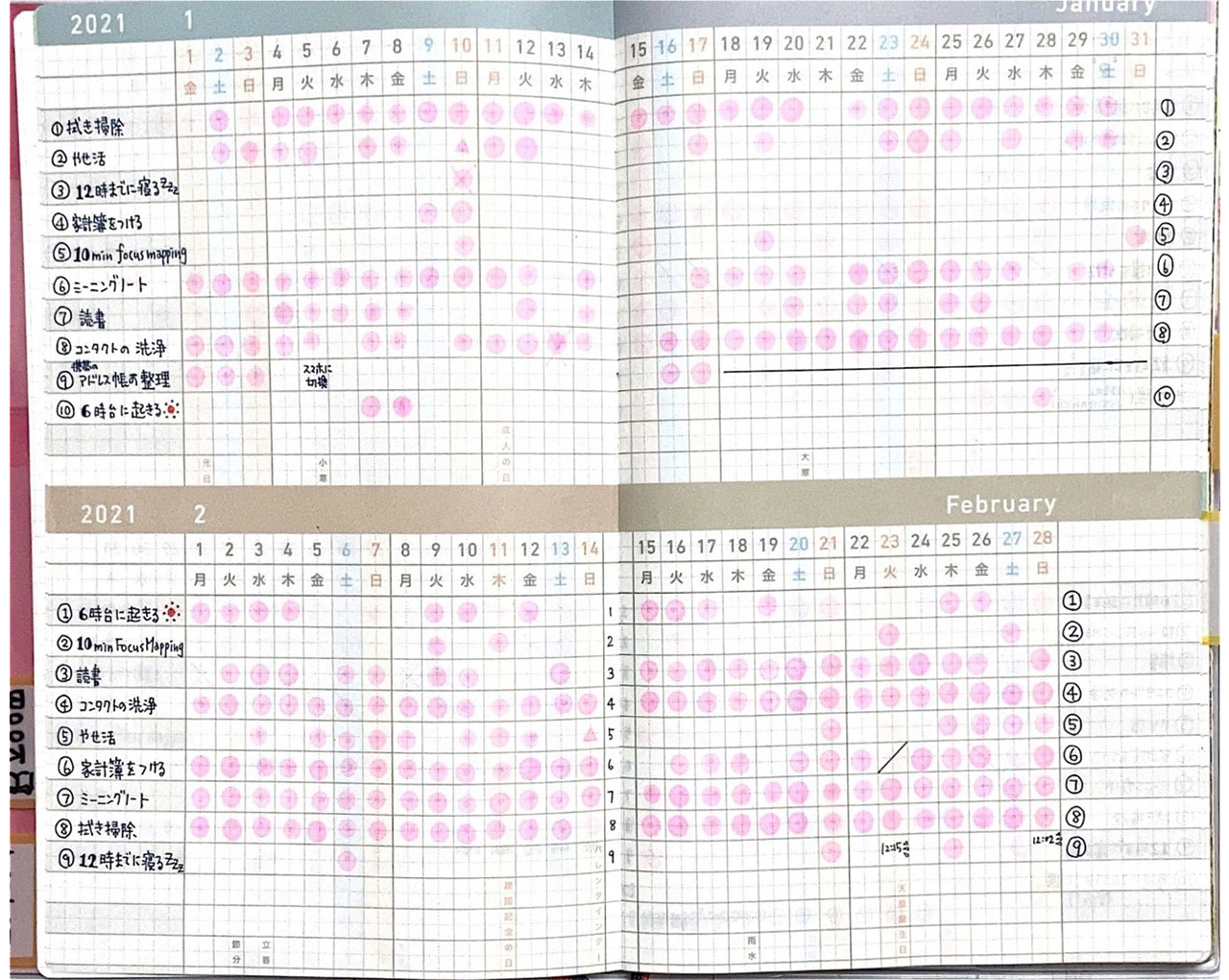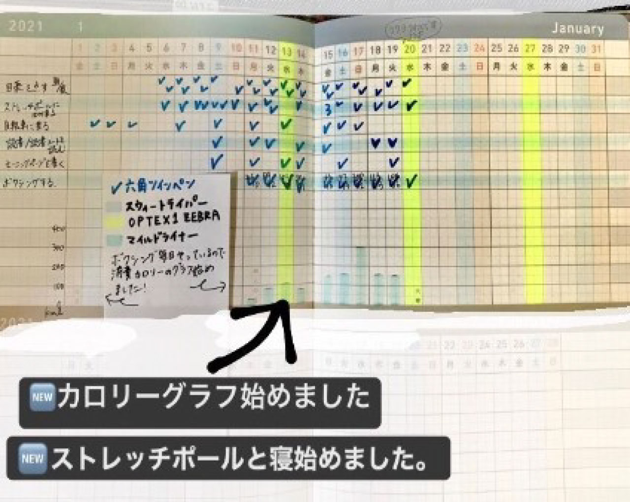 I set myself simple health goals and write down things it would be a good idea to do, like applying eye drops to look after my eyes! I’m supposed to take the eye drops in the morning and before bed, so I put two check marks in each square (top left for the morning and bottom right for the evening). And when I’ve done my kickboxing, I not only check it off, but also write down how many calories I’ve burned! Weirdly, although it’s just a simple log, when I check it off every day, it makes me want to try hard again tomorrow! ♬