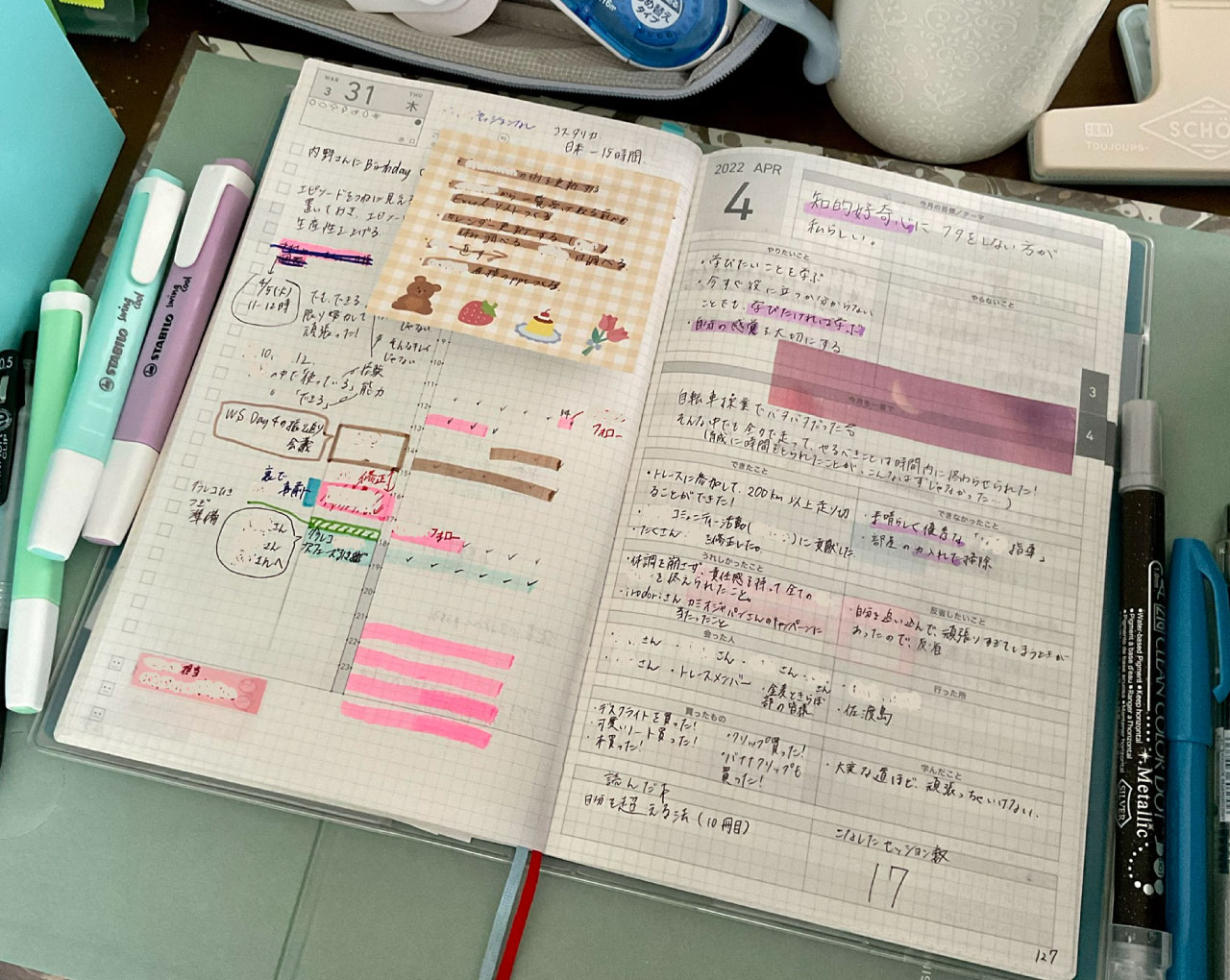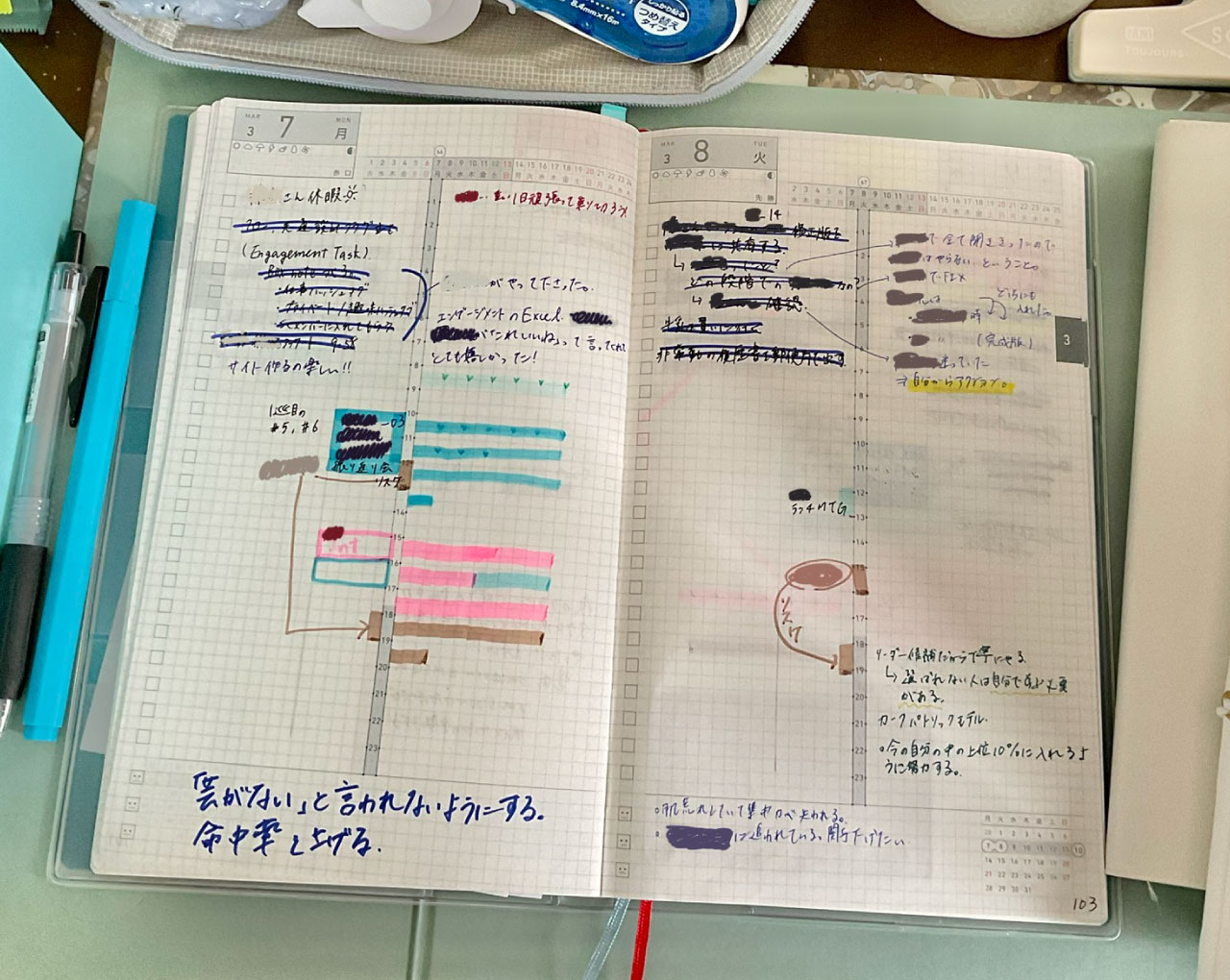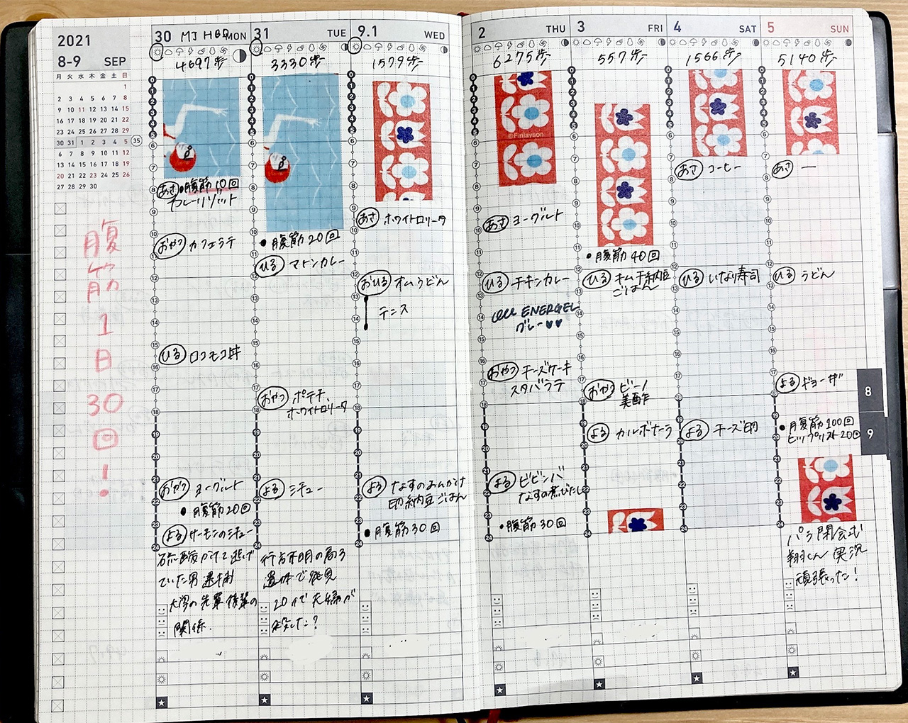I set myself simple health goals and write down things it would be a good idea to do, like applying eye drops to look after my eyes! I’m supposed to take the eye drops in the morning and before bed, so I put two check marks in each square (top left for the morning and bottom right for the evening). And when I’ve done my kickboxing, I not only check it off, but also write down how many calories I’ve burned! Weirdly, although it’s just a simple log, when I check it off every day, it makes me want to try hard again tomorrow! ♬