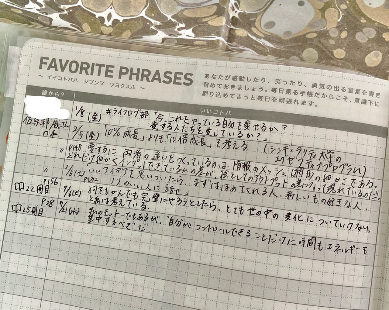 Favorite Phrases: I write down phrases I happened to come across, that I feel a connection with. Rather than aiming to fill in all the lines, I want to create a list of phrases that resonated with me at the time. It doesn’t matter how many there are. For me, the significance lies in enriching myself through the very act of writing down and collecting the phrases. Incidentally, I’ve started to realize that it’s also important to me to know when and in what sort of context I encountered each phrase, so from now on I’m going to include that information.