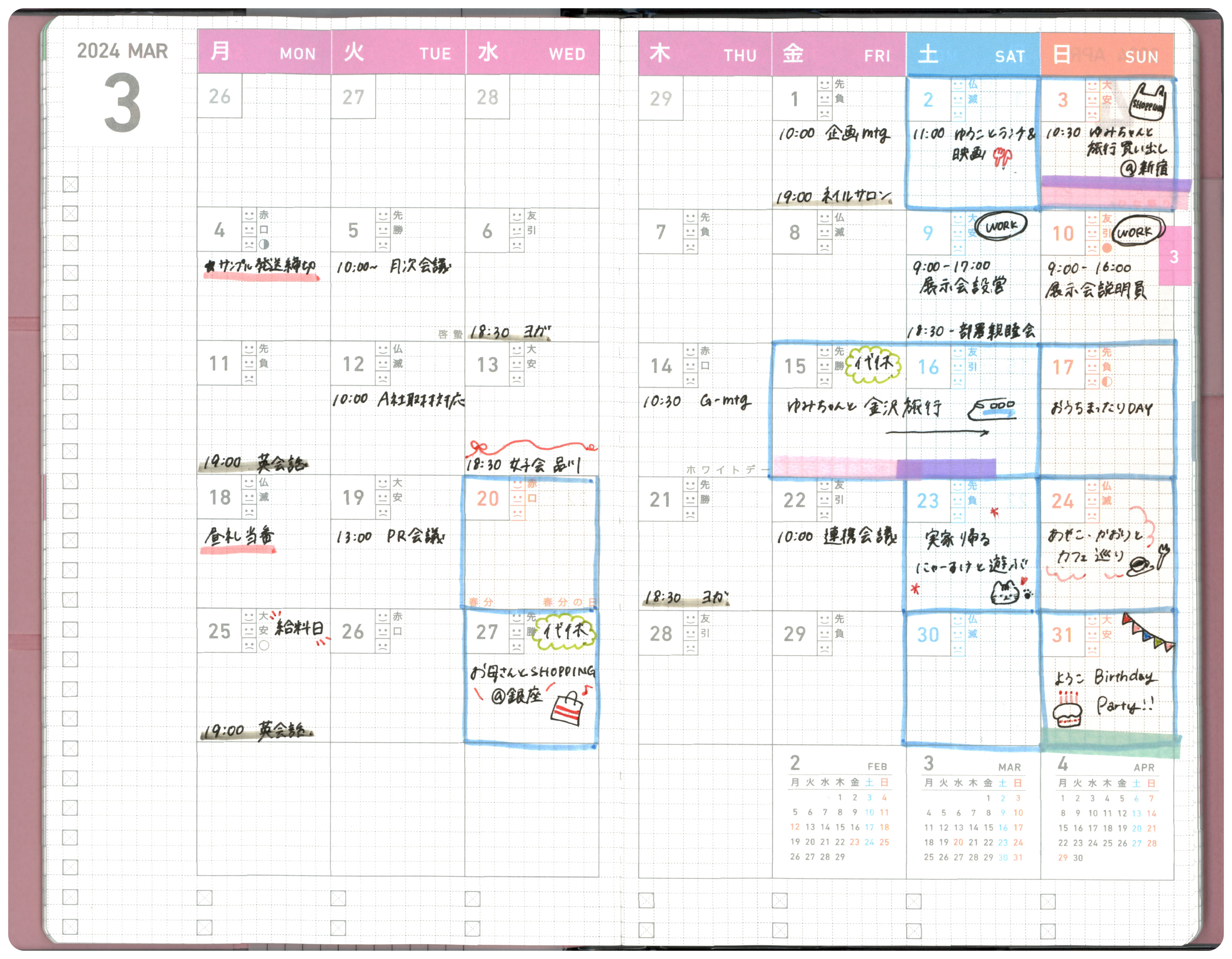 仕事もプライベートも一緒に記入。マスキングテープやスタンプも一緒に使って楽しくログができます。