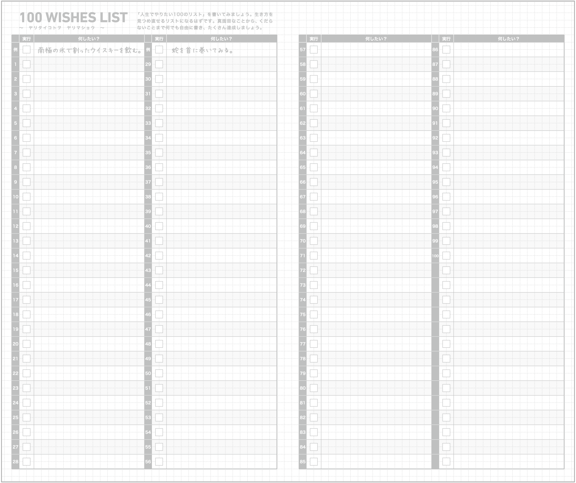 ⼀度はやってみたいことを書くことで、⽣き⽅を⾒つめ直せるリストになるはず。真⾯⽬な事から、くだらない事まで何でも⾃由に書きましょう。