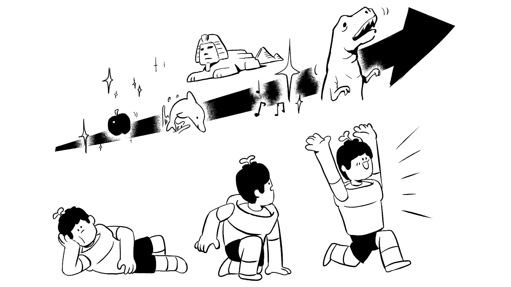 - はじめは身近な世界から、やがて恐竜の時代や宇宙まで