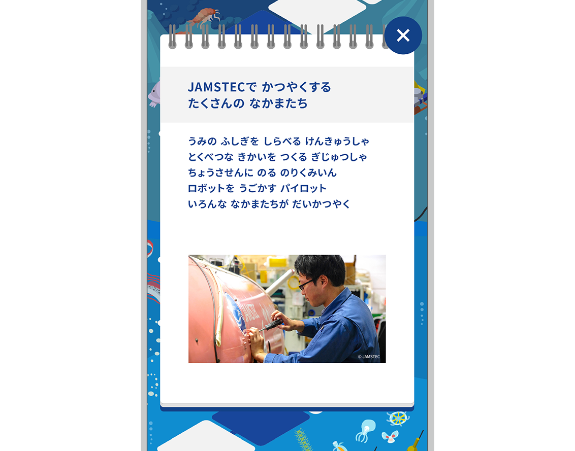 コラボレーションしたやる気の達人は、海と地球の謎を日夜探究している海洋研究開発機構、その名も、JAMSTEC(ジャムステック)。たくさんの研究者とエンジニアやパイロットが活躍して、うみのふしぎを解き明かしているぞ!