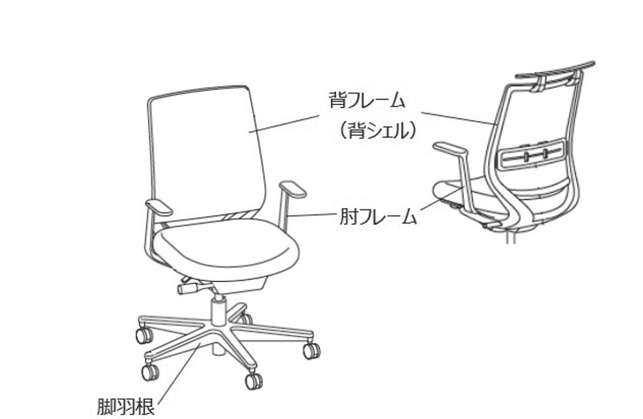 背フレーム(背シェル)、肘フレーム、脚羽根