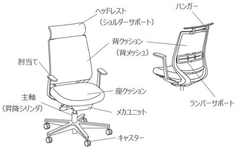 肘当て、キャスター、昇降シリンダ、座クッション、背クッション、メカユニット、ヘッドレストなど