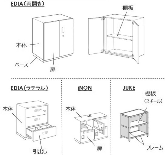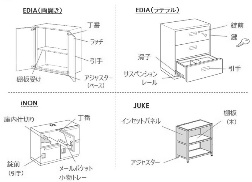 アジャスター、棚受、木部材、樹脂部、ガラス、可動部、オプション、EDIA耐火庫など