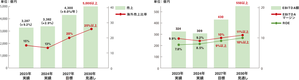 ステーショナリー事業の日本市場は縮小傾向が継続し、中国も厳しい市場環境が続くものと想定していますが、インドやASEANは人口と所得の増加を背景に堅調な成長を見込んでいます。そうした成長市場の需要を取り込みながら、年平均3%の売上高成長と2024年比0.9ポイント向上となるEBITDAマージン10.6%を目指します。
