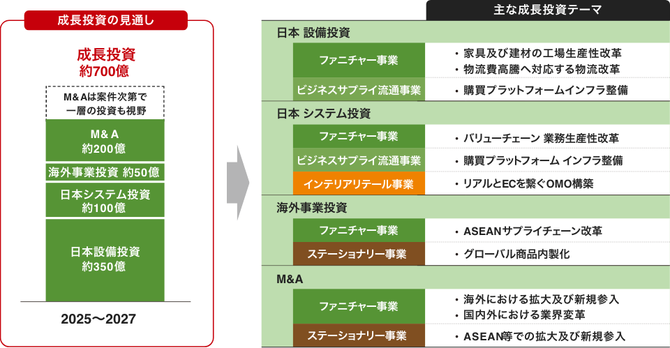 日本ファニチャー事業の生産設備に関してはこれまで更新投資に軸足を置いてきました。裏を返せば、生産性改善の大きな余地が残されています。生産革新投資等を通じ、売上総利益率のさらなる改善を図り高い付加価値と価格競争力で圧倒的な差別化を図っていきます。物流面での効率化も進めます。定常投資としての約190億円と、成長投資としての約700億円の大きなポーションを、それら領域に重点投資し、競争力強化につなげていきます。